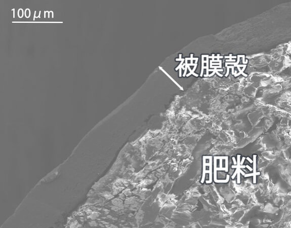 被覆肥料断面の顕微鏡写真。独自の技術で皮膜殻を調整することにより、肥料成分の溶出を制御。
