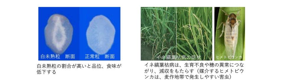 温暖化の進行に伴い、イネの実る期間が高温傾向になると、米の一部又は全部が白く濁った白未熟粒の発生が増加し、米の食味や精米したときの歩留まりの低下や、それによる販売価格の低下を招くことが問題となっています。