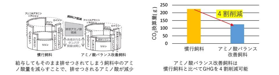 ➔ CO2換算で汚水処理時のGHGを4割削減可能とし、河川湖沼の自然環境に与える影響も減少 - アミノ酸バランスを調整し、慣行飼料と同額以下の飼料を開発