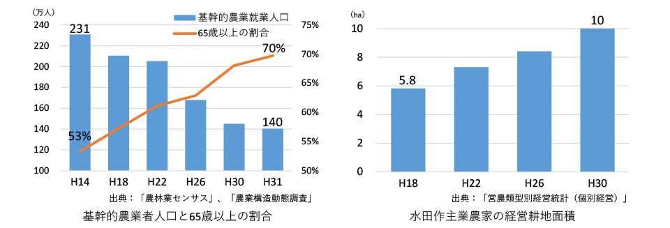 農業就業人口の大幅な減少や高齢化が進行する中で、水田作等の土地利用型農業では、作付面積の維持・拡大のため、経営面積が年々増加しています。