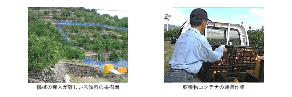 果樹や園芸作では、人手による限られた期間での収穫作業や収穫物コンテナなどの運搬において、長時間にわたる厳しい作業姿勢や重いコンテナ等の持ち上げ作業が必要とされており、これらへの対応が求められていました。