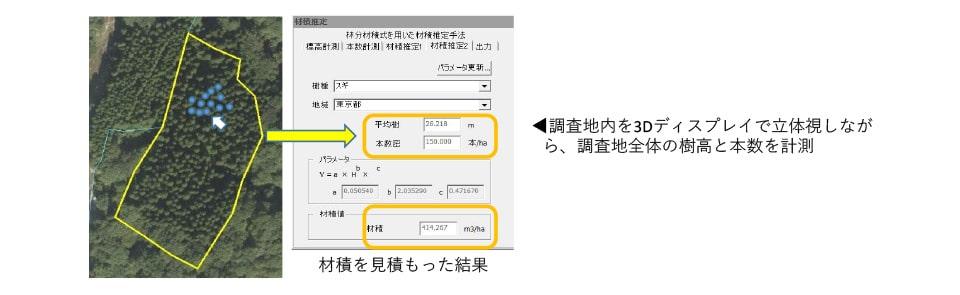 デジタル空中写真から読み取れる情報からスギやヒノキ、カラマツの幹の合計体積(林分材積)を求めるための推定式を開発し、森林立体視ソフトに適用することで、森林を伐採する際に、現地調査へ行かなくても簡単に林分材積を推定できるようになりました。