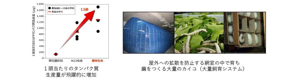 ➔ 効率的なタンパク質生産に利用できる遺伝子を特定し、特定のタンパク質について1頭当たりの生産量を従来比約13倍に増加するシステムを構築 - カイコへの効率的な遺伝子導入技術の開発と大量飼育システムの開発