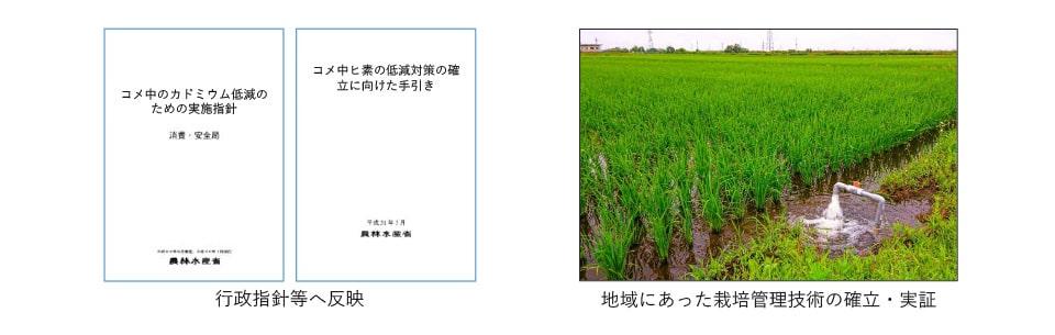 お米に意図せずして含まれるヒ素やカドミウムを同時に低減する栽培管理技術を開発し、行政指針等の策定に貢献しました(「コメ中のカドミウム低減のための実施指針」「コメ中ヒ素の低減対策の確立に向けた手引き」)。