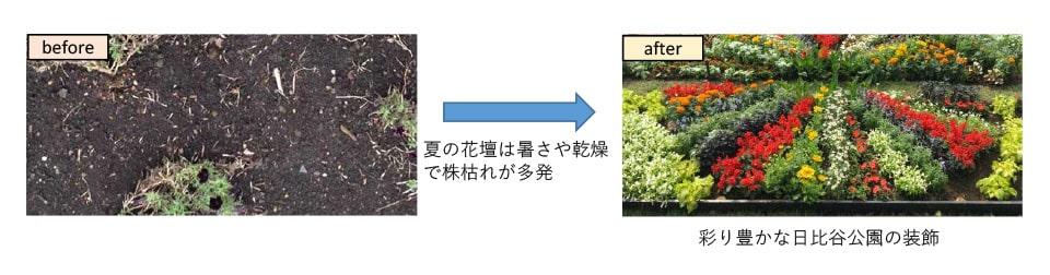 夏は花壇の植栽を美しく維持することが非常に難しい季節ですが、ビンカやペンタスなど夏に栽培できる品目やその植栽技術を「夏花による緑化マニュアル」にまとめました。現在、都立公園を中心に都内50か所以上の植栽に活用されており、今後、夏の彩りが増えていきます。