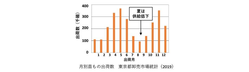 また、特に近年夏は、気温が著しく高くなり、植物の栽培や切り花の日持ちに影響を与えており、例えば苗ものの7~9月の出荷数は、5月や11月と比較して著しく減少しています。