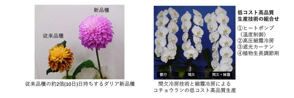 ➔ 従来品種の2倍である10日間の日持ちが可能となり、お盆等での安定供給が可能 - 間欠冷房や根域温度制御による省エネ栽培技術、日持ち性を向上する低温品質管理技術等を開発