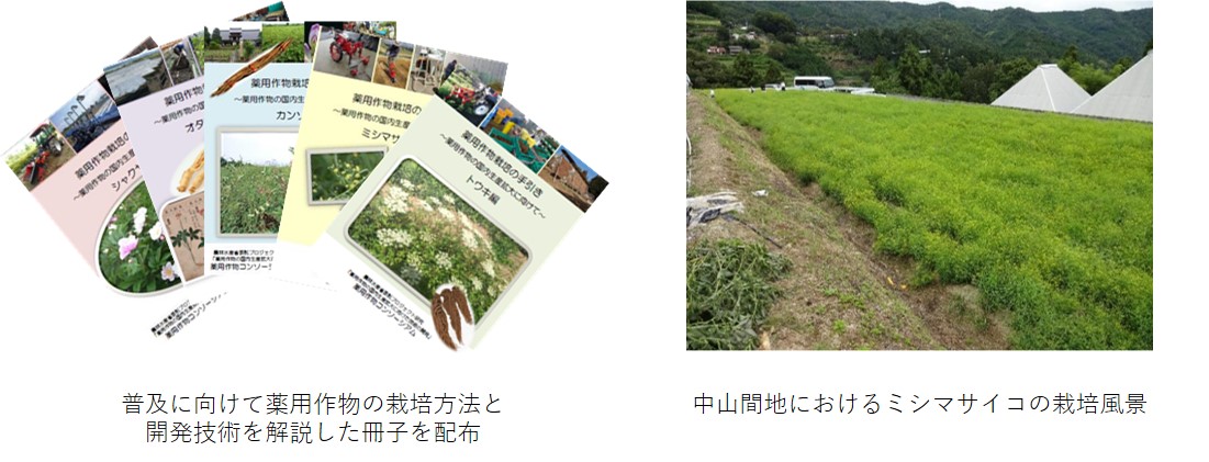 薬用作物を既存の地域の農業体系に導入し、収益を確保できる経営モデルを盛り込んだ手引きを活用して普及に取り組んでいます。中山間地域などで導入され、新たな産地の誕生が期待されます。