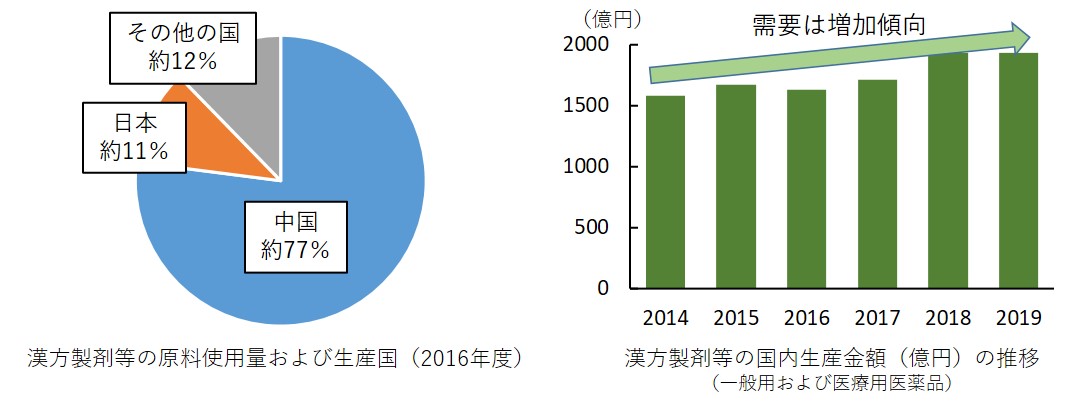 漢方製剤等の原料となる生薬は国内需要の約9割を輸入に頼っていますが、輸入元の海外において環境保全等の観点から採取や輸出を規制する動きがあり、安定的な調達が難しくなりつつあります。