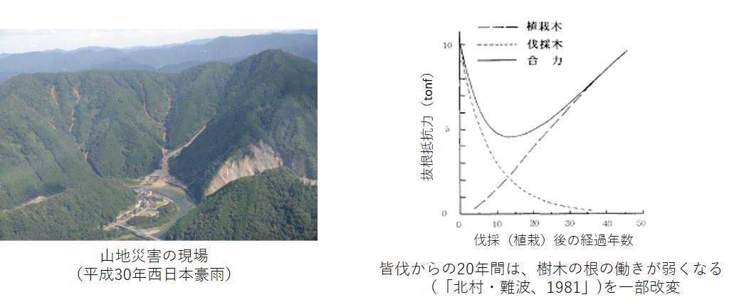 一方で、林業の活性化により林業区画の樹木を全て伐採するような収穫(皆伐)が増加しており、皆伐・植林からの20年間は根が十分に張らないため、土砂災害の発生リスクが高くなると言われています。
