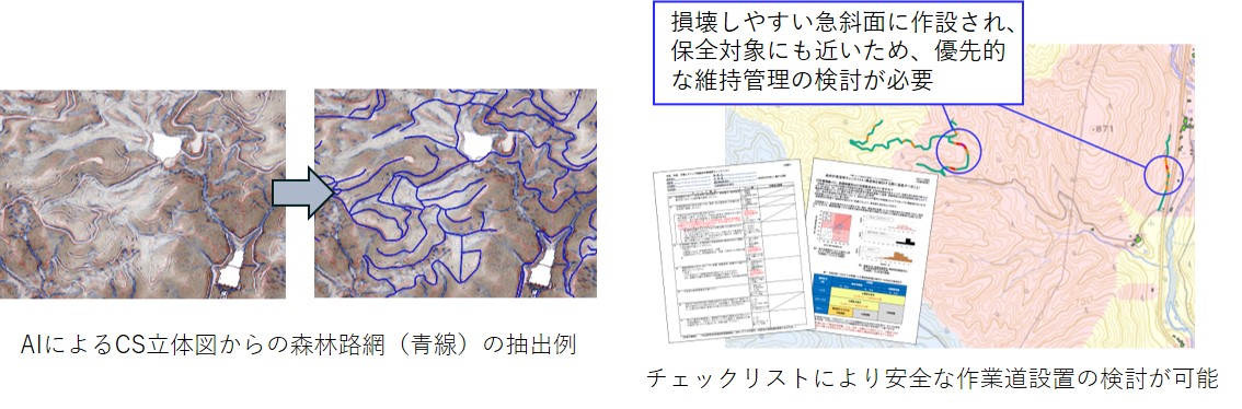 災害リスクと収益性によって色分けされた地図やチェックリストにより、「災害を防ぐために伐採を避ける場所」及び「林道開設により収益性が高くなる場所」の把握が容易になります。