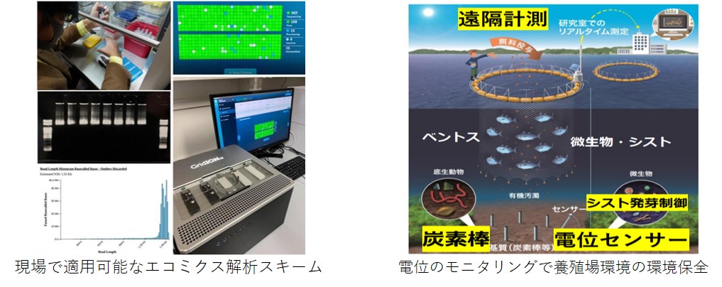また、世界で初めて電位に基づき海底環境を把握するシステムを構築し、養殖場環境の改善技術を開発しました。コストを数万円に抑え、クルマエビ水槽で汚染の進行を抑制する効果が認められています。