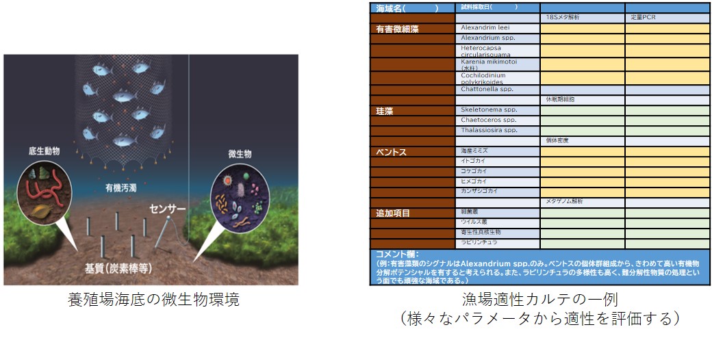 赤潮発生の可能性、海底環境の強靱さなど、養殖場として満たすべき微生物学的条件についてのデータを「漁場適性カルテ」として提供することで、より合理的な漁場選定が可能になります。