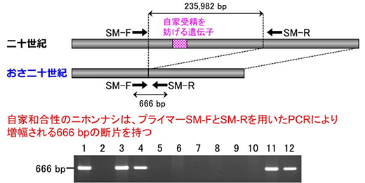 ニホンナシでは、「二十世紀」の突然変異体として、自家受粉で結実し(自家和合性)、人工受粉を省力化できる「おさ二十世紀」がある。「おさ二十世紀」では、自家受精を妨げる遺伝子を含む235,982 bpの領域が欠失していることを解明し、自家和合性のニホンナシを選抜できるDNAマーカーを開発した。