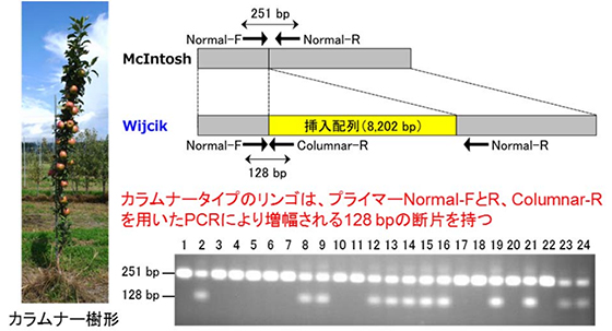 リンゴでは、「McIntosh」の突然変異体として、カラムナータイプ(円柱状)の樹形を示す「Wijcik」が発見され、せん定や収穫の省力化、機械化が期待されている。「Wijcik」の変異の原因として、8,202 bpの配列(レトロポゾン)が挿入されていることを解明し、カラムナータイプのリンゴを選抜できるDNAマーカーを開発した。