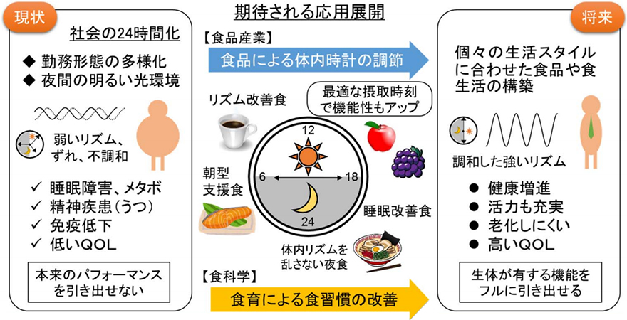 高齢者人口の増加に伴い健康寿命の延伸が課題となる中、食事からの効率的な栄養摂取や食生活の改善による健康増進への期待が高まっている。また、社会の24時間化が進んだことで、体内時計の不調に起因する健康リスクも増加している。体内時計を活用した新しい食科学に、健康増進実現への突破口としての役割が期待されている。