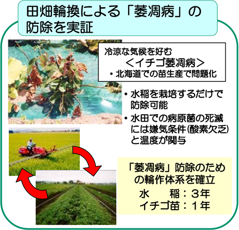 田畑輪換により病原菌が死滅する要因には、嫌気条件(酸素欠乏)と温度が関与していることを明らかにした。