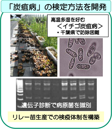 無病苗生産に必要な、増殖用親株や苗における「炭疽病」の検定方法を開発した。