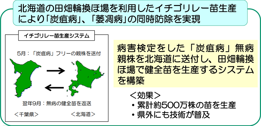 千葉県のイチゴ栽培では、高温多湿を好む「炭疽病」の発生が苗生産上の問題となっていた。そこで千葉県では、平成12年より「炭疽病」の回避を目的として、夏季冷涼な北海道に苗生産を委託するイチゴリレー苗生産を開始した。しかし一方で、委託先の北海道では、冷涼な気候を好む「萎凋病」の発生が新たに問題となった。