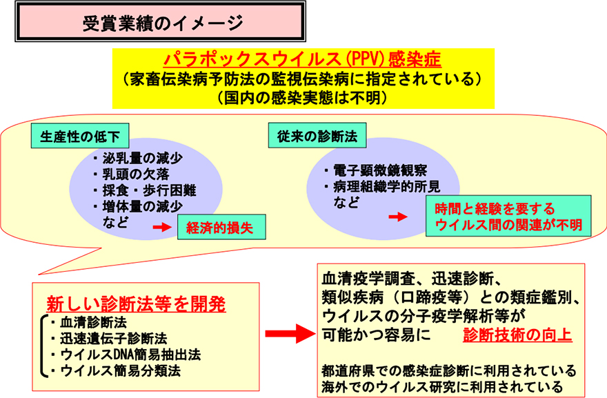 これらの成果は現在、動物衛生研究所や都道府県での病性鑑定、類症鑑別に用いられており、また海外の研究者らのウイルス研究等にも広く利用されている。