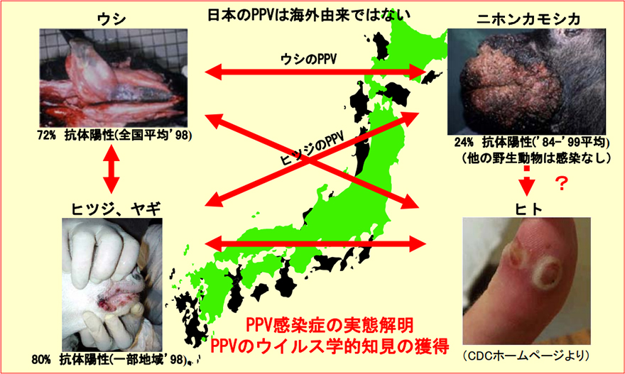 パラポックスウイルス(PPV)感染症は、牛、羊、ヤギ、カモシカなどに見られ、まれにヒトにも感染する伝染性皮膚疾患である。PPVの感染は、乳量や肉量の減少などの経済的損失をもたらすにもかかわらず、国内のPPVの感染実態や、動物種ごとのPPVの違いや伝播性などは不明であり、その診断法の確立が強く求められていた。