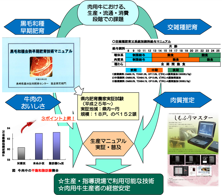 黒毛和種肥育牛生産における技術的課題解決に向け、早期肥育技術、おいしい牛肉の生産技術および超音波エコー画像を用いた精度の高い脂肪交雑推定ソフトの開発を行った。研究成果は、全国和牛能力共進会で活用され、長崎県初の内閣総理大臣賞を受賞した。また、県内の肉用牛関連事業への展開がなされ、「長崎和牛」ブランド力の強化に大きく寄与した。