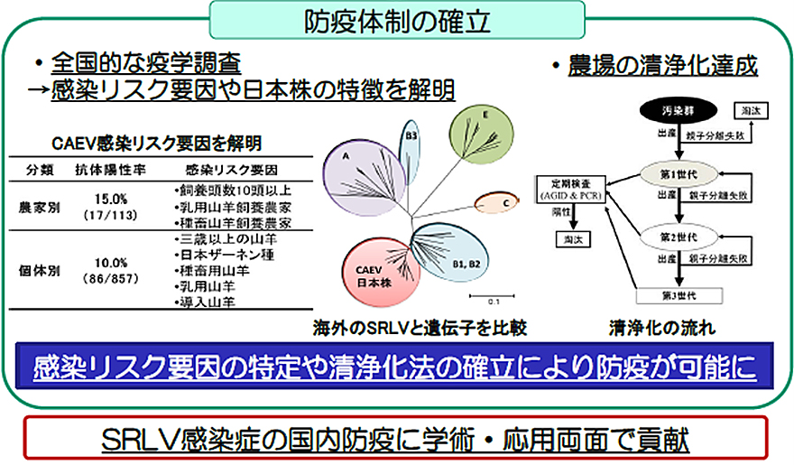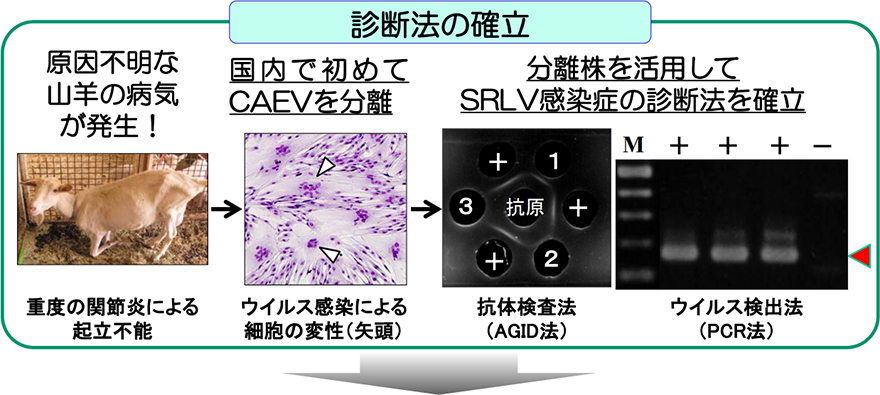 平成24年に同じくSRLV感染症であり、届出伝染病でもある羊のマエディ・ビスナが国内で初めて発生した際には、開発した診断法が迅速な防疫に大きく役立った。