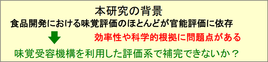 味は食品の品質を決定づける重要な要因であるが、その評価法は人間の味覚に頼る官能評価が主流であり、未だ分子機構を利用したものはほとんど開発されていない。そこで、不明な点が多い味覚受容機構を解明して利用することにより、科学的根拠に基づいた新たな味覚評価系を開発し、従来の官能評価系を補完することを目的とした。