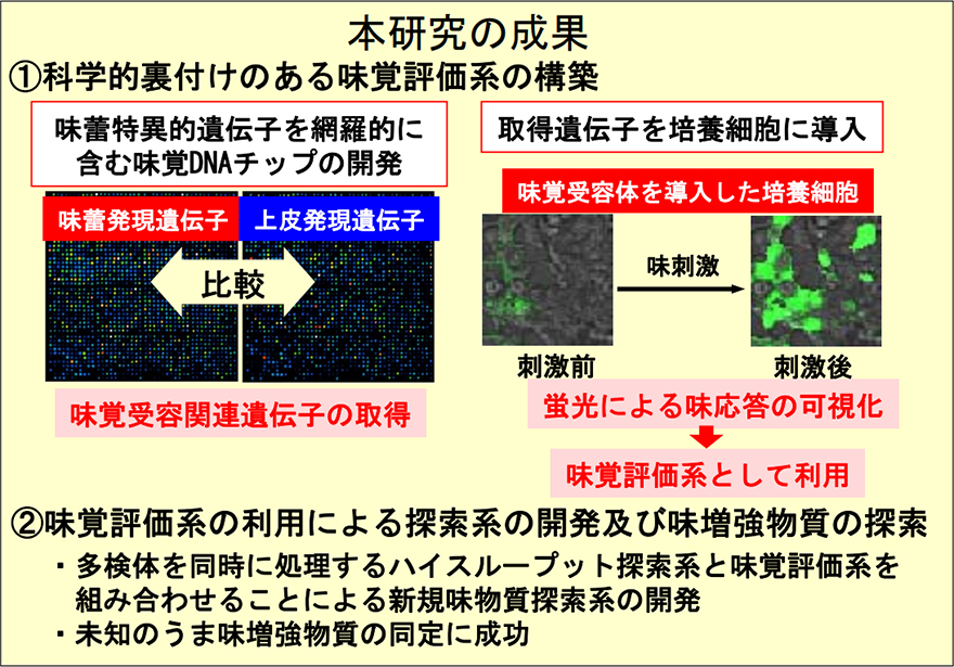 本研究では、まず、独自に開発した味覚DNAチップによる味覚受容関連遺伝子の探索や取得遺伝子の機能解析を行い、明らかにした味覚受容機構を培養細胞内に強制的に導入することで味覚応答を人工的に再現して評価する系を構築した。そして、その構築した味覚評価系を効率よく利用することを目的に、培養細胞の応答測定系を微小空間に集積させたハイスループット探索系※を企業と共同開発した。さらに、構築した味覚評価系と企業と共同開発したハイスループット探索系を組み合わせることにより、新規味物質探索系へ発展させ、今までにその効果が知られていないうま味増強能を有する食品成分の同定に成功した。