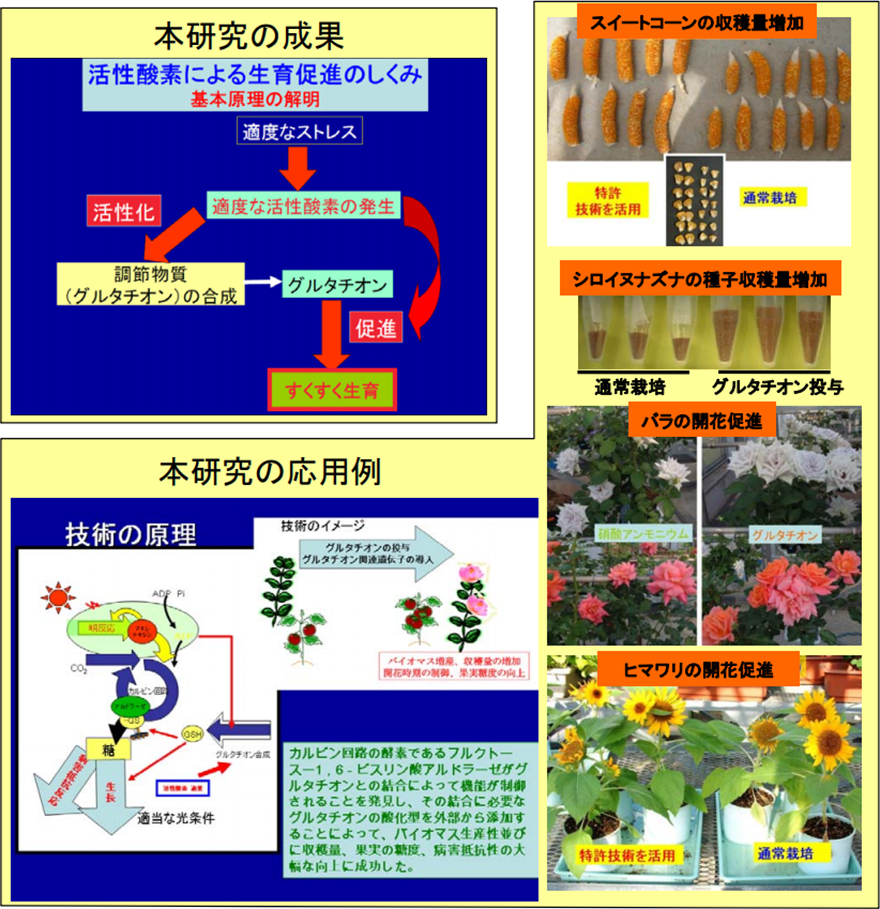 さらに、グルタチオンが植物体内の特定のタンパク質に結合して、そのタンパク質の機能を制御することを世界に先駆けて解明したことで、グルタチオンと細胞内タンパク質の結合を促進する酸化型グルタチオンが農作物の収穫量・果実品質を大幅に向上させることを発見した。グルタチオンの農業利用(収穫量や品質、開花制御など)については、企業や各地の試験場レベルで実用試験が進められており、食料増産や品質向上に大きく貢献することが期待される。