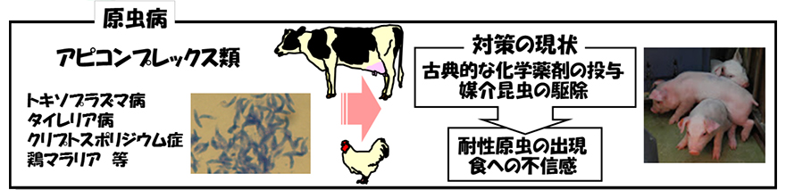我が国では、原虫病を含めた感染症による食に対する危機感や風評被害が起こっているため、現在の原虫病対策に取って代わる革新的な技術開発が求められている。