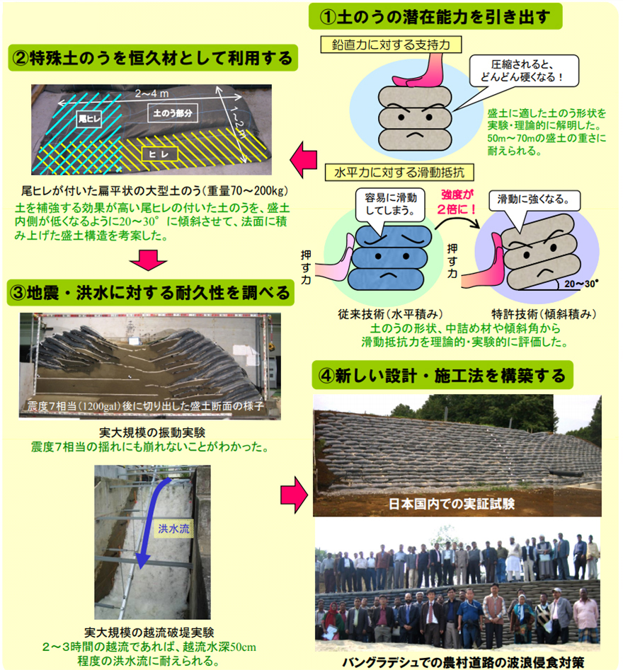 上記の土のうを盛土内側が低くなるように傾斜して、法面に積み上げた盛土構造を考案した。要素実験及び実物大実験により、従来のように土のうを水平に積んだ盛土は、震度5程度の地震で崩壊するが、上述のように盛土背面に傾けて土のうを積むことで、滑動抵抗力が高まり、震度7程度の地震に対しても崩壊しないことがわかった。