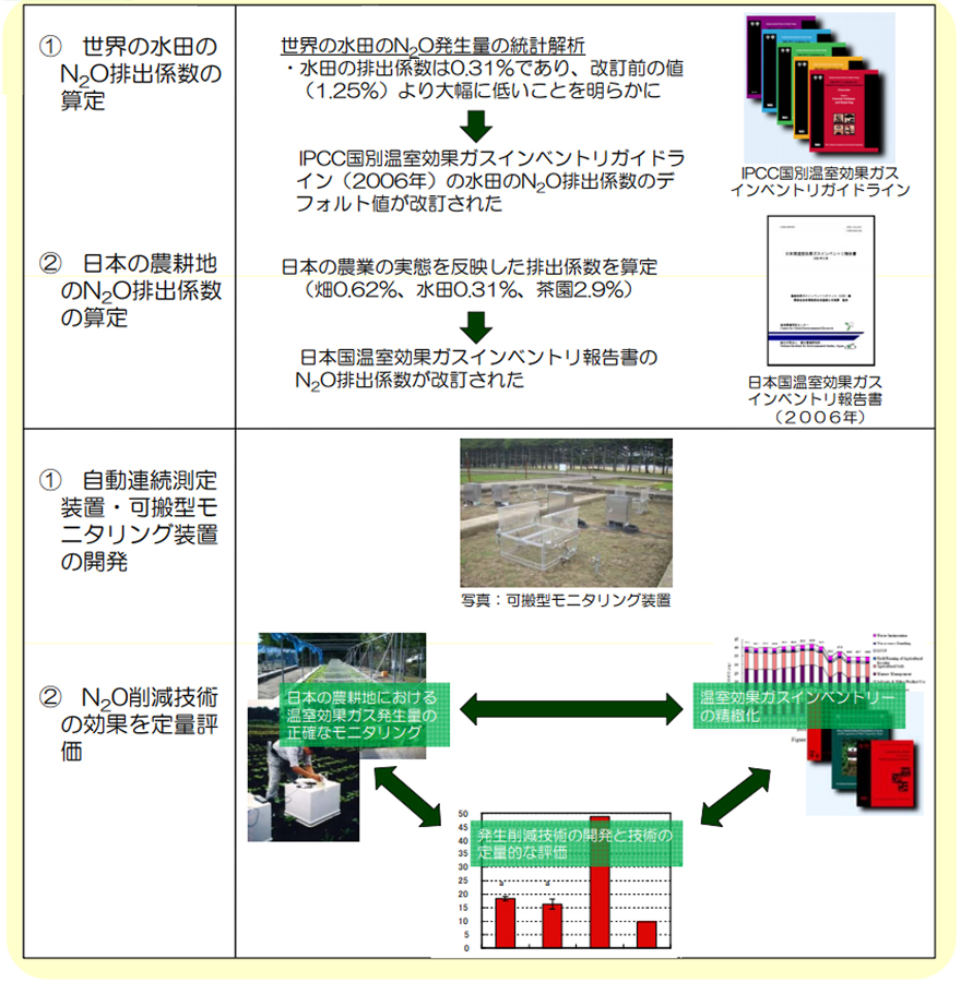 日本の農耕地におけるN2O発生量についても排出係数を算定し、その結果は、日本国温室効果ガス排出・吸収インベントリ報告書に採用され、排出量算定の精度向上に貢献