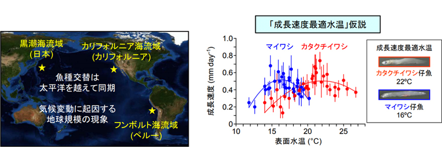 既存の有力説はカタクチイワシとマイワシで摂餌生態が異なることに着目した「栄養動態」仮説であった。これに対し、カタクチイワシとマイワシの間で初期生活史における成長速度最適水温が異なることに着目した「成長速度最適水温」仮説を提唱した。