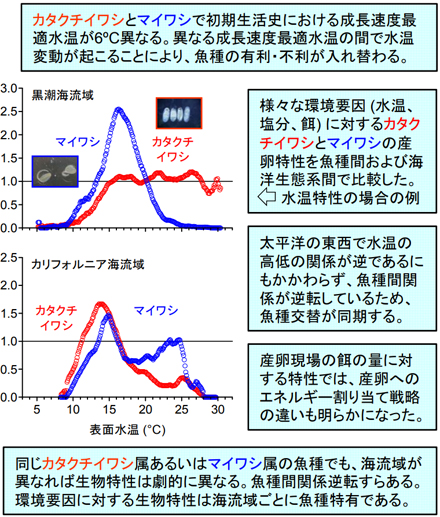 同じカタクチイワシ属あるいはマイワシ属の魚種でも、海流域が異なれば生物特性は劇的に異なる。環境要因に対する生物特性は海流域ごとに魚種特有であることを示した。