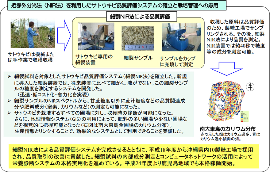 従来、サトウキビの品質は搾汁液を利用して測定されていたが、細裂したサンプルを直接分析する「細裂NIR法」を確立した。同システムは、平成18年度から沖縄県の10製糖工場に導入され、全システムの維持・管理を行っている。また、個々の機器をネットワーク化することによ て することによって、低コストな機器管理を実現している。さらに、同システムを利用して肥料成分(窒素、カリウム等)を同時に分析し、農家への栽培支援の効果を実証した。