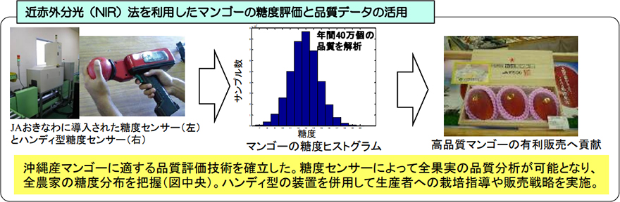 マンゴーの糖度を測定する検量線を開発するとともに、品質と栽培環境に関する研究を行った。産地の全マンゴーについて糖度分布を明らかにするとともに、品質のデータベースを構築することによって、農家の個別診断・評価が可能となった。糖度測定システムは品質評価だけでなく、農家への栽培指導、販売ツールとして利用されている。