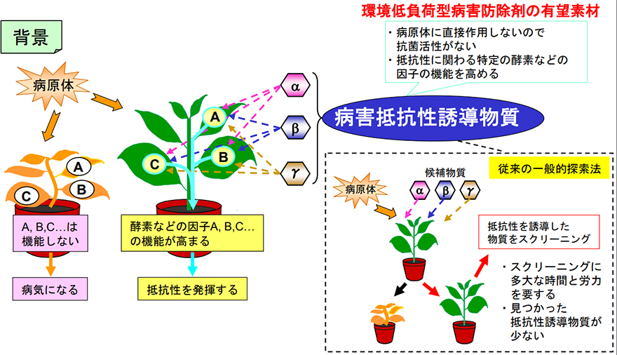 作物の環境低負荷型病害防除手法として、病原体を直接殺す殺菌剤等に代わり植物が本来有する病害抵抗性を高めて病気を防ぐ病害抵抗性誘導剤の開発に期待が集まっている。しかし、実際に候補物質と病原体を植物に与えて調べるという従来の探索法は多大な時間と労力を要することもあり、実用に耐えられる病害抵抗性誘導物質がみつかった例は少ない。