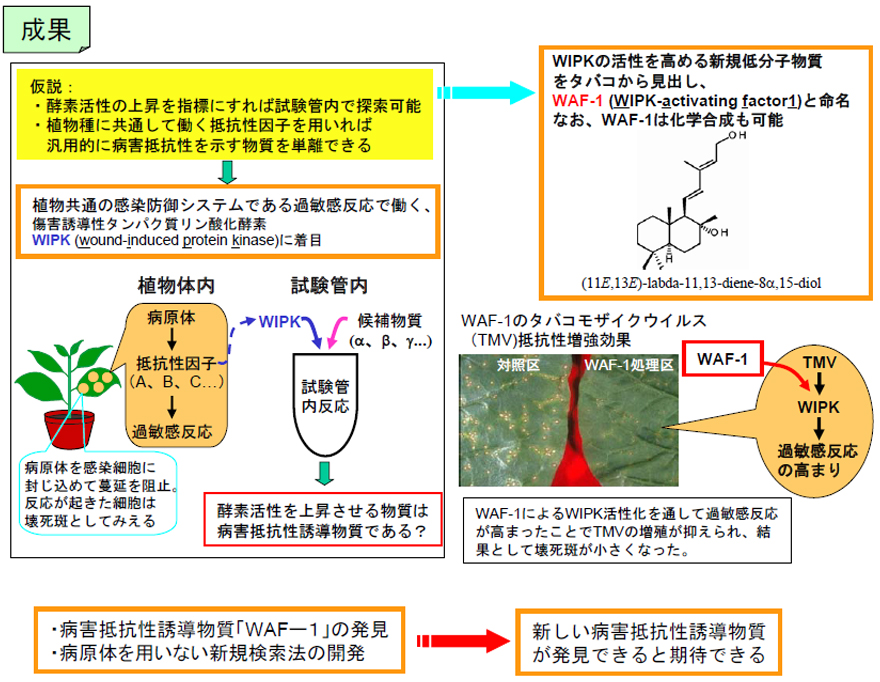 病害抵抗性誘導物質は、特定の酵素などの因子の機能を高めることで植物に抵抗性をもたらすと考えられている。そのような酵素の活性の変化を指標にすれば病害抵抗性誘導物質を植物体外で探索できるのではないか、さまざまな病害や植物種で共通に働く酵素を用いれば、汎用的に病害抵抗性を示す物質を探索できるのではないかと考えた。そこで、病原体を感染細胞に封じ込めて蔓延を防ぐ過敏感反応と呼ばれる植物共通の感染防御システムに受賞者らが発見しWIPKと命名した酵素が関わることに着目、その活性を上昇させる物質を、環境への影響の少なさ及び将来的な実用化のし易さも見据えて天然低分子物質を中心に探索した。その結果、タバコ中のある低分子物質がWIPKの活性を高めることを発見し、これをWAF-1と命名した。WAF-1投与植物ではある種の病害に対する過敏感反応が高まっており、植物体外で示されたWAF-1の作用が植物体内でも発揮されていることを確認できた。また、WAF-1の化学合成にも成功し、合成品が天然品と同等の活性を有していることも確認した。