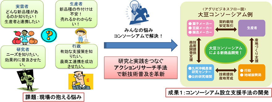 技術開発の効率化と研究成果の迅速かつ効果的な普及を目的に、1)ニーズ共有・情報コミュニケーション手法の開発、2)新技術普及コンソーシアムの効果的な構築手法の開発、3)コーディネート技術の開発を行い、研究と実践をつなぐ「アクションリサーチ手法」により効果を実証した。