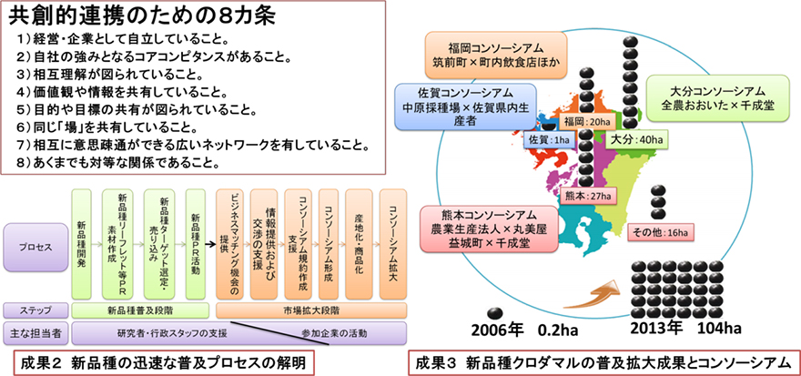 コンソーシアム方式による迅速な技術普及方策についての重要なポイントを共創的連携のための8箇条として提示し、新品種普及を促進するコーディネーターの役割を示した。