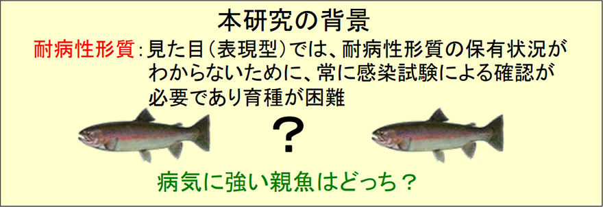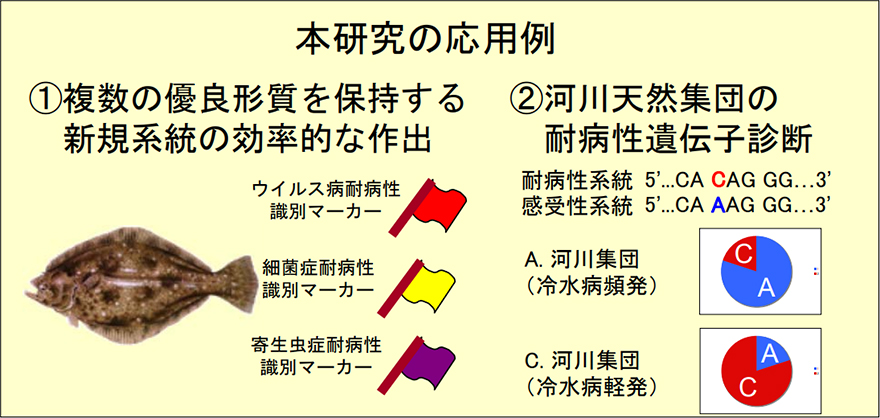 本研究では、ニジマス、アユ、ヒラメ等の複数の養殖魚類において、それぞれ耐病性 形質を識別可能な遺伝マーカーを開発し、それ用いた分子育種は実用化レベルにある。