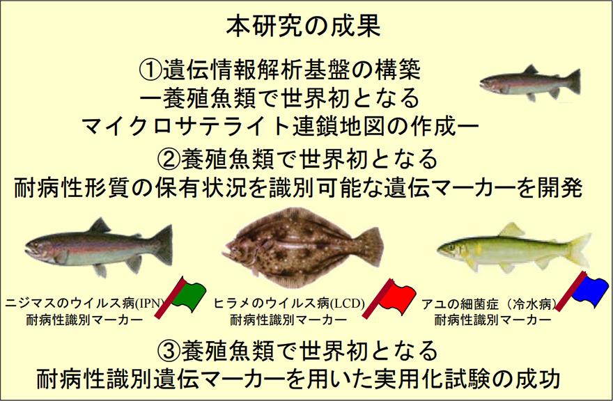 本研究では、水産育種における遺伝マーカーとしてマイクロサテライトマーカーの有 効性を報告した。そして、養殖魚類における遺伝マーカーを用いた連鎖地図、および、 それを基に耐病性形質を識別可能な遺伝マーカーを世界で初めて報告した。