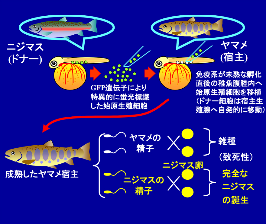 本研究では、ニジマスを材料に用い、卵と精子のおおもとの細胞である始原生殖細胞を、クラゲ由来の緑色蛍光タンパク質(GFP)遺伝子で標識し、この蛍光を指標に本細胞を生きた状態で大量に単離・精製する技術を確立した。単離した始原生殖細胞を免疫系が未熟で異種細胞を拒絶する能力を保持しない孵化直後の稚魚の腹腔内に移植すると、移植した始原生殖細胞は、宿主の生殖腺に向かって自発的に移動し、そこに取り込まれた後、宿主の生殖腺内で機能的な卵や精子にまで分化した。さらに、本移植技術を異種間にも応用することで、ニジマスの卵や精子を生産するヤマメを作出し、得られた配偶子由来の正常なニジマス次世代個体を得ることに成功した。