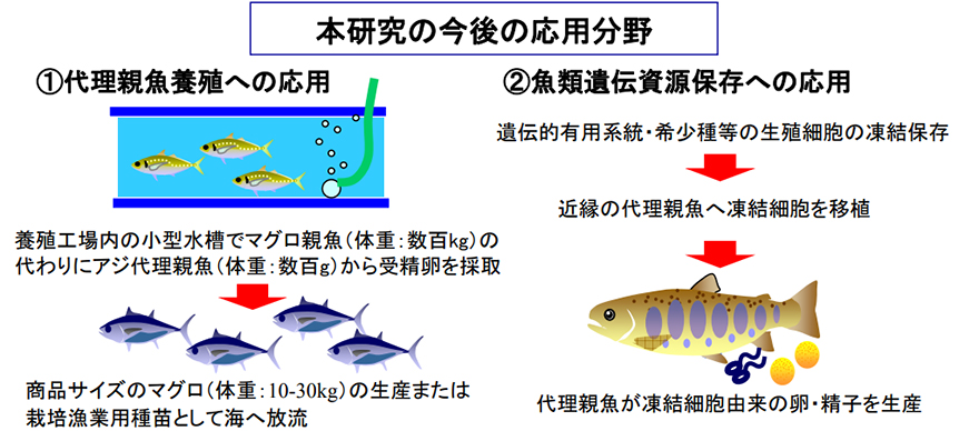 マグロのように大型で飼育が難しい魚種の卵や精子を、小型で扱いやすいアジやサバのような魚種に生産させる技術の開発を目指し、魚類の代理親魚養殖の基盤技術を確立した。