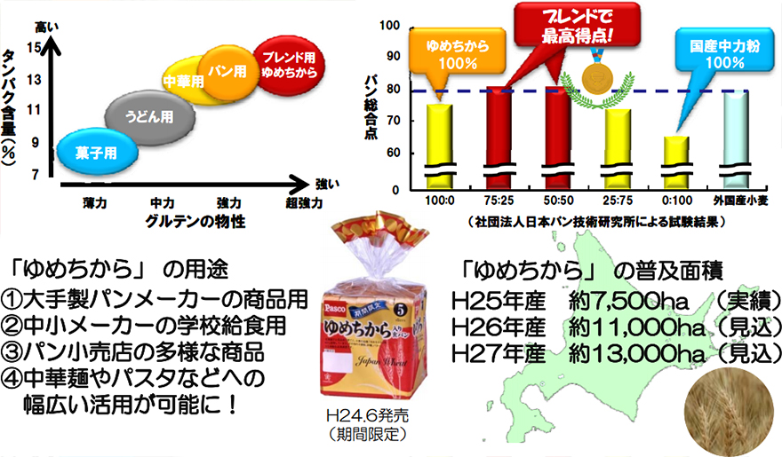 従来の国産小麦には存在しなかった強靱なグルテンを持ち、かつ、高タンパク含量の超強力秋まき小麦を選抜し、超強力小麦の高分子・低分子グルテニンの遺伝子の組み合わせを持つ「ゆめちから」が実需者から高い評価を得ることを実証した。