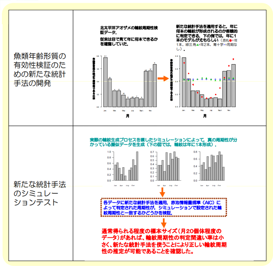 輪紋周期性は 通常 大量に漁獲した魚の年齢形質サンプルから硬組織最外縁の輪紋状況と標本採集時期のデータを用いて観測されるが、客観的・定量的に輪紋周期性を推定する手法は存在しなかった。輪紋周期性の判定を誤った場合、年齢査定結果に大きな誤差をもたらすことになり、資源管理の失敗に繋がる恐れがある。