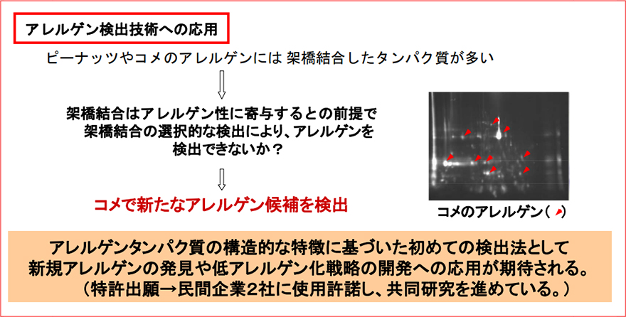 また、タンパク質の構造を強固に保つ架橋結合がタンパク質の分解抵抗性に関わり、ひいてはアレルゲン性に関係しているとの前提に立って、本法をアレルゲン物質の検出に応用したところ、ハウスダスト、花粉、穀物について既知アレルゲンタンパク質に加え、新規アレルゲン候補タンパク質を見出す等、本法の有用性を実証した。