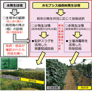東北地方のキュウリ産地では、ホモプシス根腐病がまん延し、深刻な被害を受けている。特に、主力の露地夏秋キュウリの場合、本病に感染すると収穫最盛期の7月~ 8月に枯死することから経済的損失が極めて大きく、有効な防除技術の開発と体系化は重要な課題である。