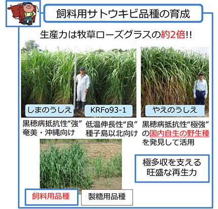 1. サトウキビと野生種との交雑により、極多収、耐病性にも優れる3つの飼料用サトウキビ品種を開発した(しまのうしえ、KRFo93-1、やえのうしえ)。やえのうしえは、国内の野生種から黒穂病抵抗性“極強”を導入し、育成した。